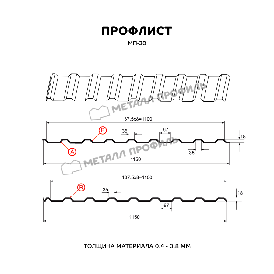 Профиль МП-20 имеет толщину 0,65 мм, что обеспечивает ему прочность и долговечность. Полиэстеровое покрытие RAL 6005 Зеленый мох придает листу эстетичный внешний вид и защищает его от воздействия атмосферных условий.