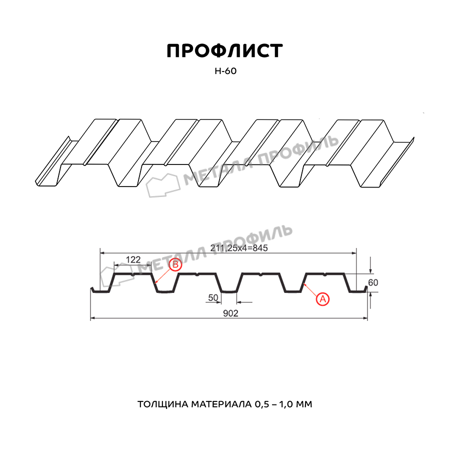 Этот профлист имеет профиль Н-60, что обеспечивает ему высокую прочность и устойчивость к нагрузкам. Толщина листа составляет 0,5 мм, что делает его легким и удобным в установке.